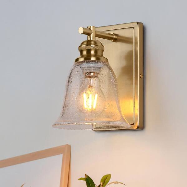 Modern 6 in. 1-Light Brushed Gold Vanity Light with Seeded Glass Shade