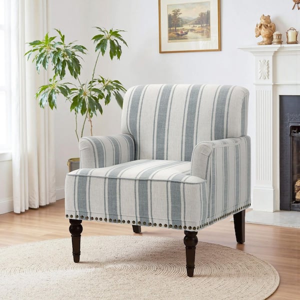 Modern Blue Striped Linen Fabric Upholstered Accent Armchair With Wooden Legs (Set of 1)