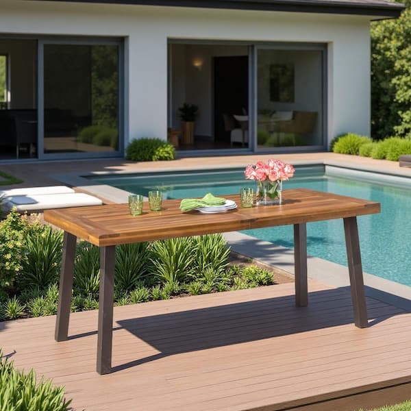 Modern Brown Rectangular Wood Outdoor Dining Table, Slatted Design Patio Table