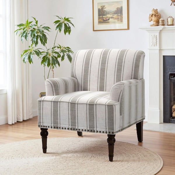 Modern Brown Striped Linen Fabric Upholstered Accent Armchair With Wooden Legs(Set of 1)