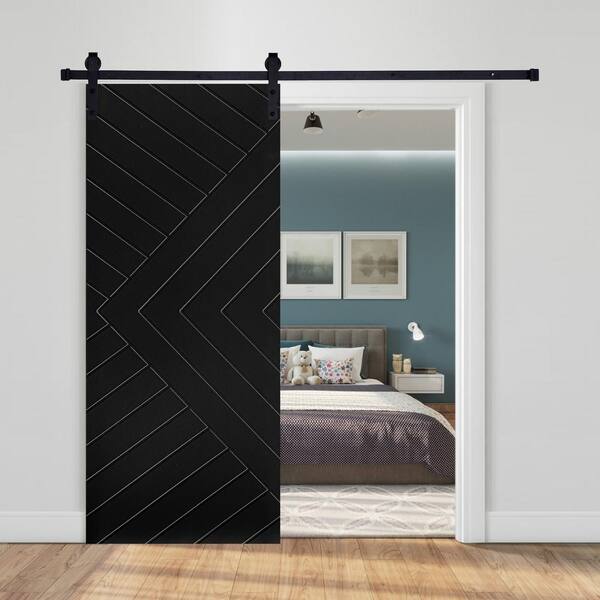 Modern Chevron Designed 30 in. x 80 in. MDF Panel Black Painted Sliding Barn Door with Hardware Ki