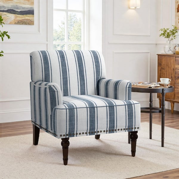 Modern Dark Blue Striped Linen Upholstered Accent Armchair With Wooden Legs(Set of 1)