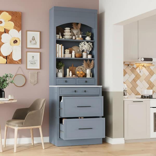 Modern Gray Pantry Faux Marble Top Cabinet Freestanding Tall Kitchen Hutch with 5 Storage Drawers and Adjustable Shelf