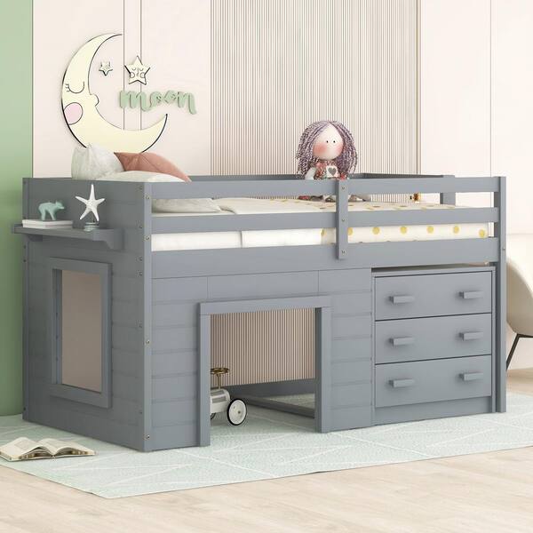 Modern Gray Twin Size Loft Bed with Cabinet and Shelf, Wood Loft Bed with 3-Drawer and Ladder for Kids, Boys, Girls