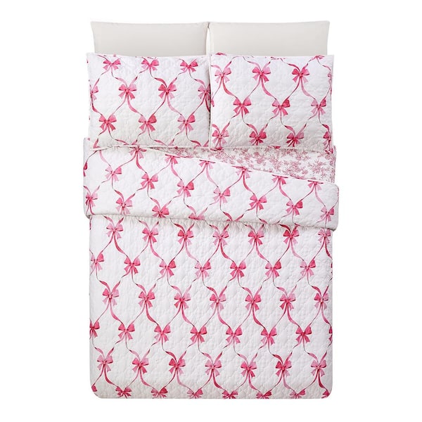 Abigail 3-Piece Pink/White Bow Microfiber Full/Queen Quilt Set