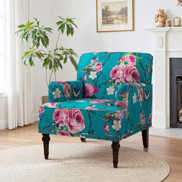 Modern Multicolor Floral Linen Upholstered Accent Armchair With Wooden Legs(Set of 1)