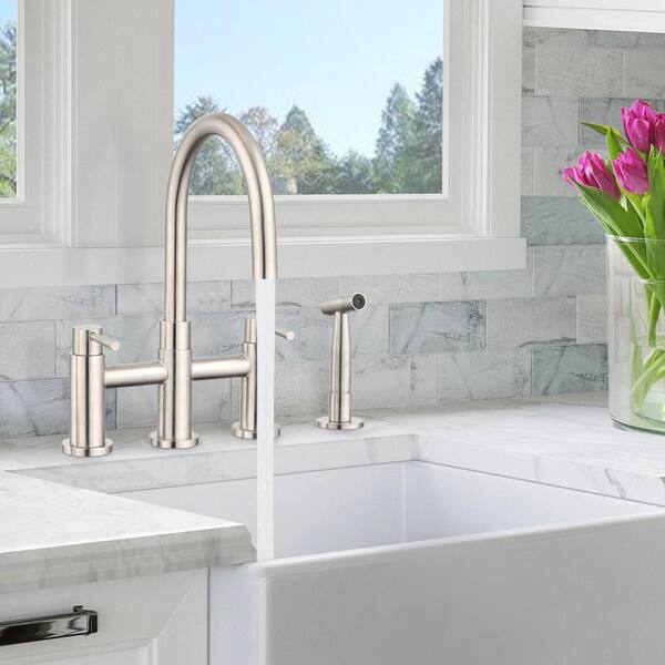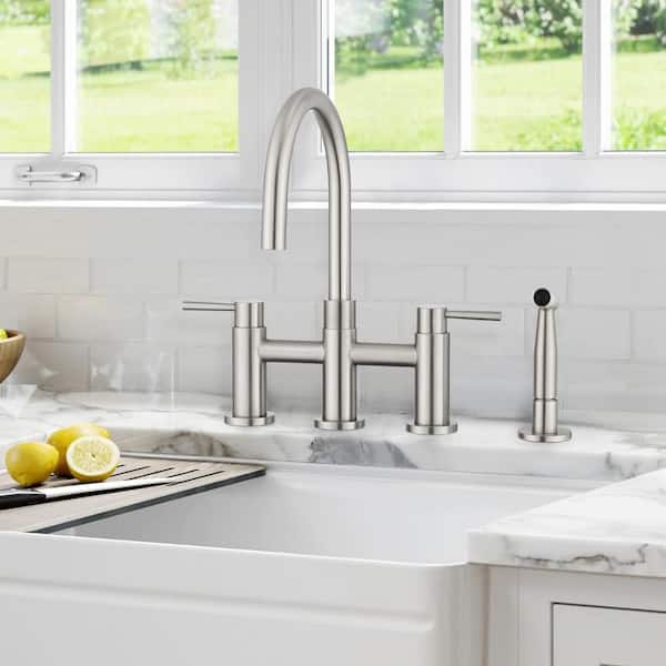 Modern Simple Double Handle Bridge Kitchen Faucet with Side Spray, Stainless Steel, 360° Swivel in Silver