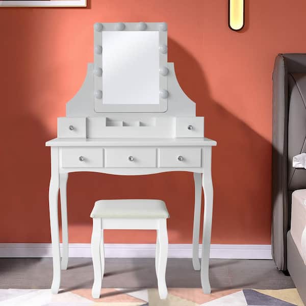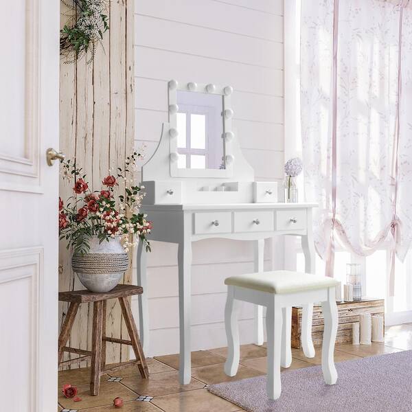 Modern White Wooden Makeup Vanity Set With Rectangle LED Light Mirror and Stool