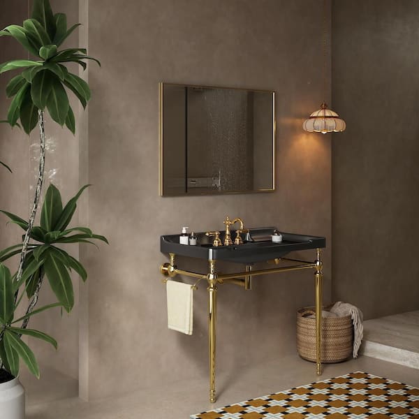 Baye 35.83 in. Bathroom Ceramic Single Console Sink in Black with Golden Stainless Steel Leg