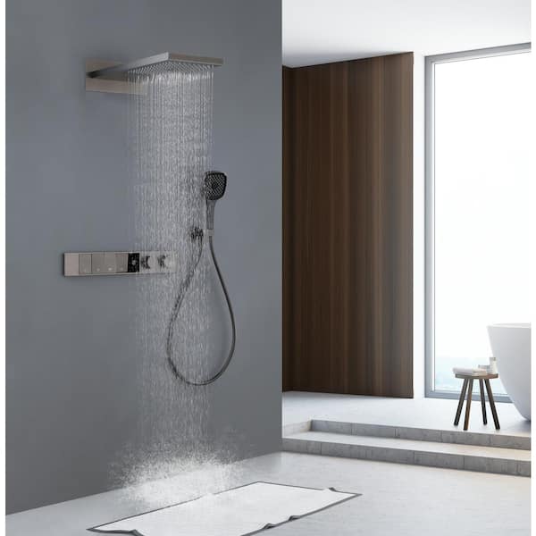 Dual Handle 2-Spray Thermostatic Shower Wall Mounting Fixed and Handheld Shower Head 4. 62GPM in Gray