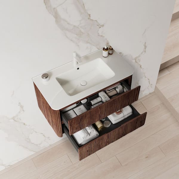 Liory 35.82 in. Single Ceramic Sink Floating Deep Walnut Bath Vanity with White Sintered Stone Top Pre-assembled
