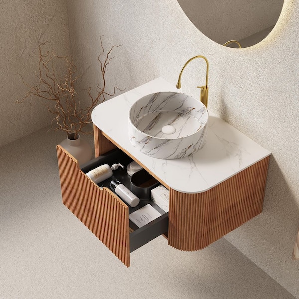 Loiry 36 in. Floating Nature Wood Bath Vanity with Ceramic Basin and White Artifical Marble Top Pre-assembled
