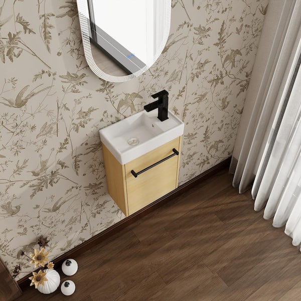Yunus 16 in. Single Sink Wall-Mounted Light Oak Bath Vanity with White Ceramic Top Unassembled