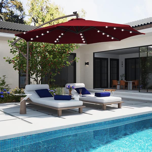 11 ft. Steel Pole Solar LED Offset Hanging Patio Umbrella with in 360° Rotation and Easy Crank in Red