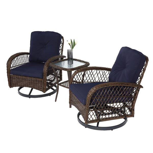 3-Piece Rattan Wicker Patio Conversation Set Outdoor Swivel Bistro Set with Navy Cushions and Glass Top Coffee Table
