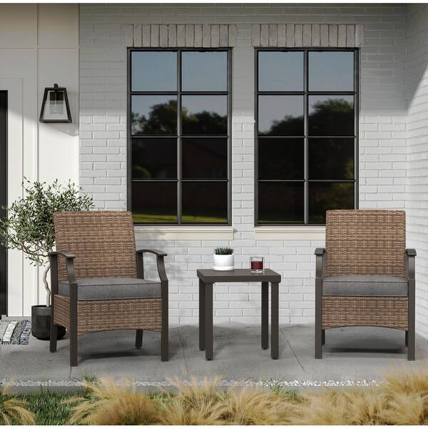 3-Piece Wicker Patio Conversation Set Outdoor Sectional Seating Side Table Set with Grey Cushions