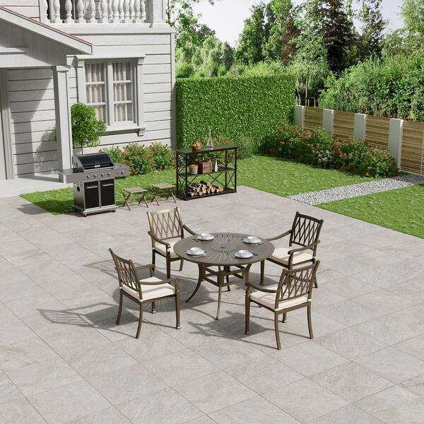 5-Piece 48 in. Round Table Brown Cast Aluminum Outdoor Dining Set with 4-Dining Chairs and Beige Cushions