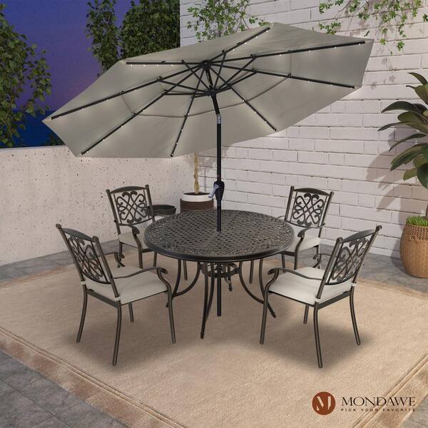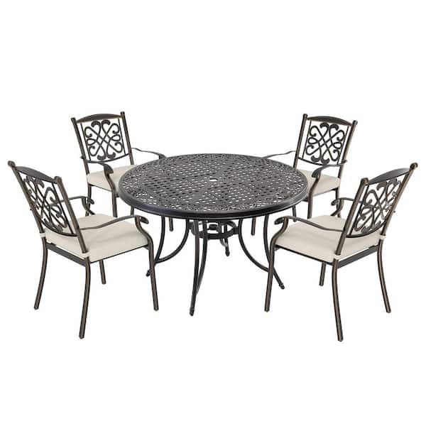5-Piece Cast Aluminum Outdoor Dining Set Round Classic Pattern Table Flower-Shaped Backrest Chairs with Beige Cushions