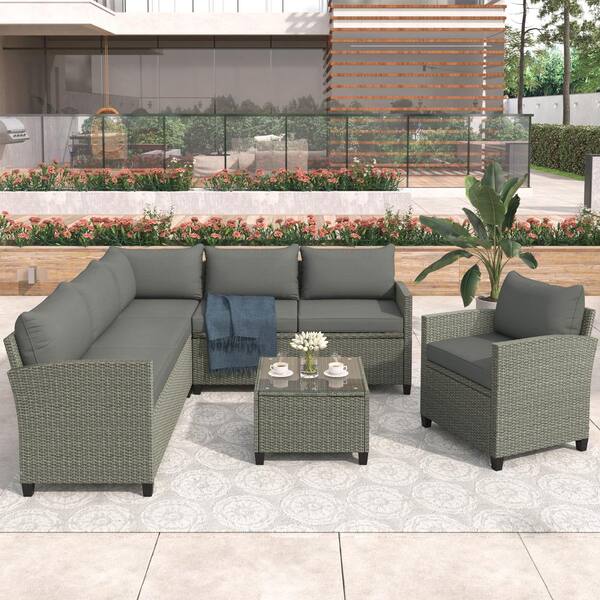 5-Piece Wicker Outdoor Conversation Sofa Set Patio Furniture Sectional Reclining Chair with Gray Cushions