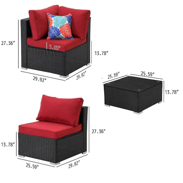 7-Piece Black PE Rattan Wicker Outdoor Sectional Sofa Set with Red Cushion and Tempered Glass Coffee Table