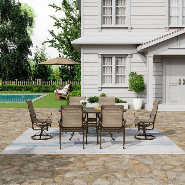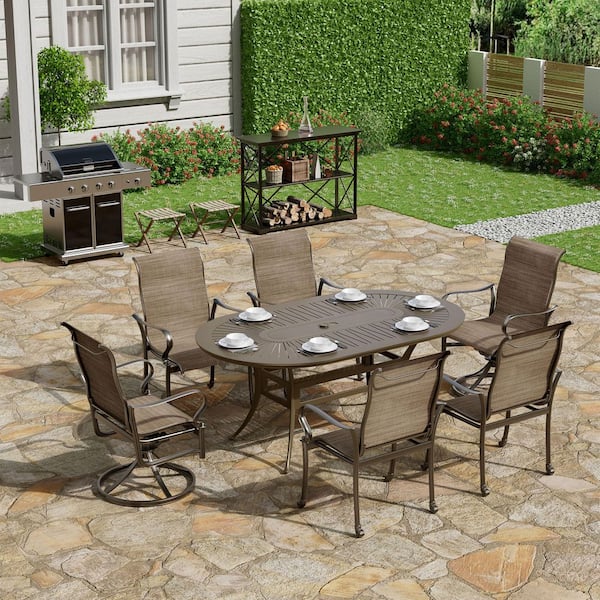 7-Piece Brown Cast Aluminum Outdoor Patio Dining Set with Oval Retro Table and Textilene Seat Chairs