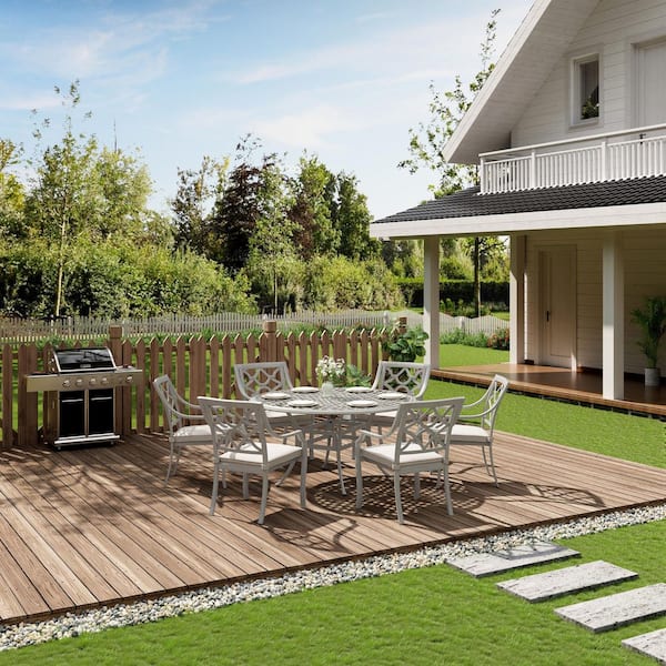 7-Piece Gray Cast Aluminum Round Outdoor Dining Set with Beige Cushions