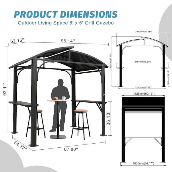 8 ft. x 5 ft. Gray Galvanized Steel Arc Roof Outdoor Patio BBQ Gazebo with Hardtop and 2 Side Shelves