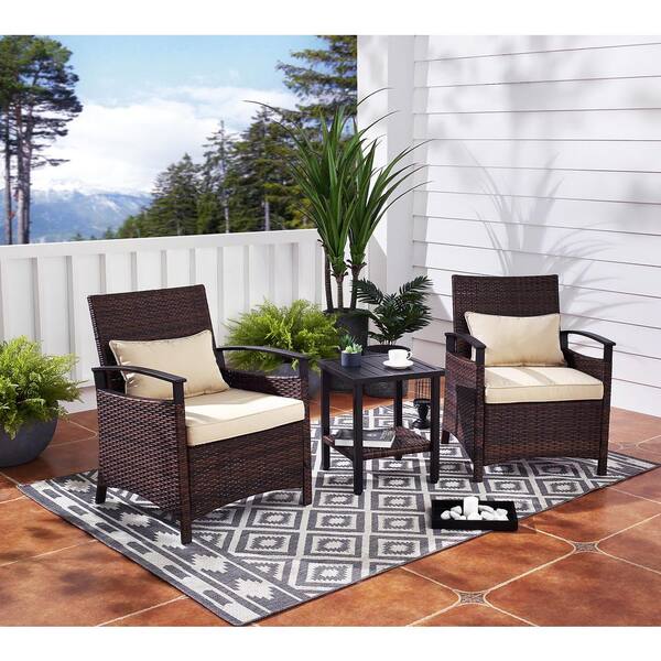 Brown 3-Piece Outdoor Wicker Patio Conversation Set Storage Side Table & Wicker Chairs Set with Beige Cushions