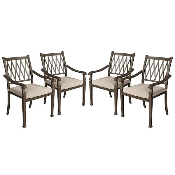 Brown Cast Aluminum Stackable Outdoor Dining Chair with Beige Cushions (4-Pack)