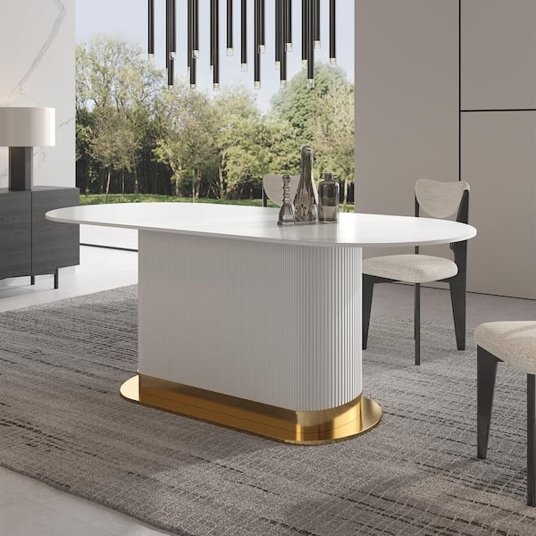 Modern Oval White Snowmass Stone Top 55.12 in. Ammonites Leather Titanium Stainless Steel Pedestal Dining Table 4-Seats