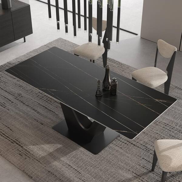 Modern Rectangle Black Lauren Black Gold Stone Top 62.99 In Stainless Steel Gunmetal Gray Pedestal Dining Table (6 Seat)