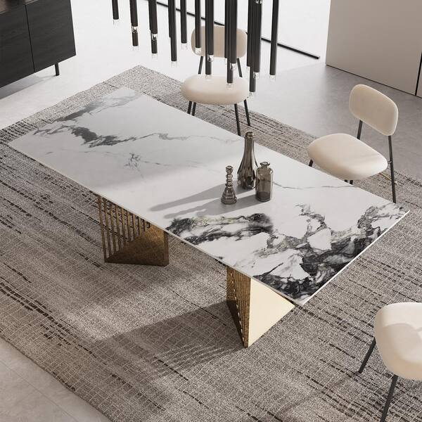 Modern Rectangle White Patek Philippe Stone Tabletop 78.84 in. Stainless Steel Double Pedestal Dining Table (10 Seats)