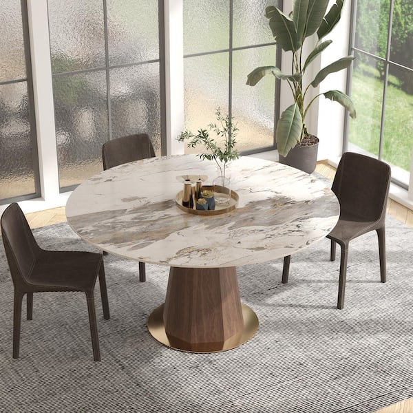 Modern Style Round Pandora Colour Pandora Stone Table Top for Kitchen 53.15 in. Walnut Pedestal Dining Table (4 Seats)