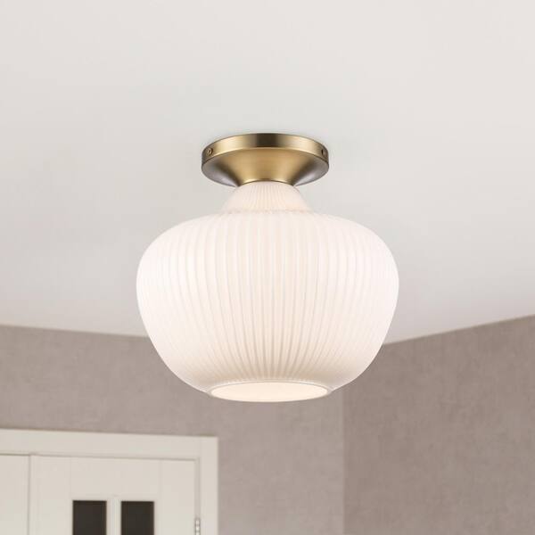 Pompton 12 in. 1-Light Gold Semi-Flush Mount Ceiling Light Fixture with White Ribbed Glass