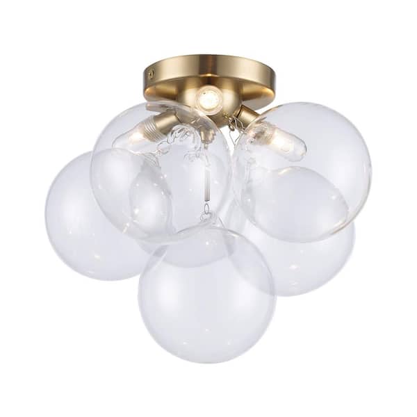 Aurora 13.3 in. 3-Light Gold Flush Mount Ceiling Light with Clear Glass Globe Shades and Halogen Light Bulbs Included