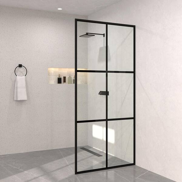 Monture 34 in. W x 72 in. H Fixed Framed Shower Screen Door in Matte Black with Patterned Glass