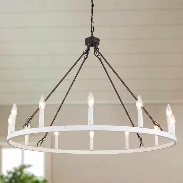 Moomal 12-Light Antique Brown/White Farmhouse Candle Dimmable Wagon Wheel Chandelier for Living Room Kitchen Island
