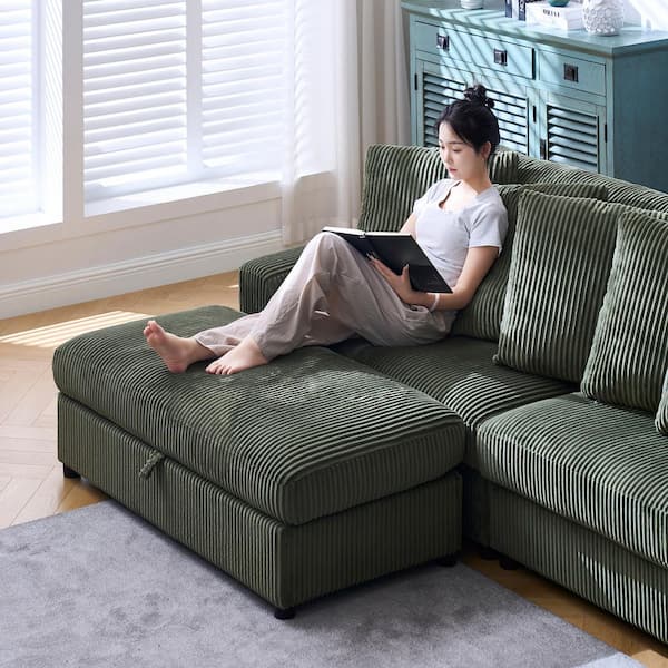 146 in. 4-Piece Ultra-Plush Corduroy L-Shape Sectional Sofa W/ Lounge Chaise Ottoman for Living Room Apartment in Green