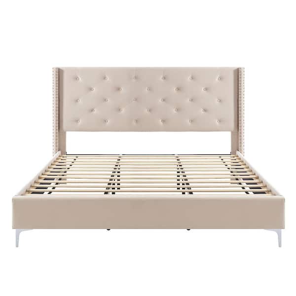 Cream Modern Fort California King Wood Platform Bed Frame No Box Spring Needed with Upholstered Headboard