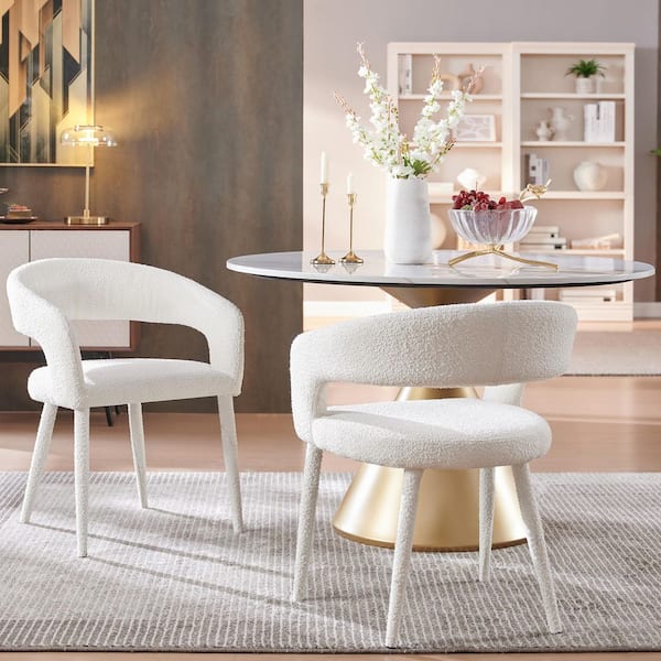 Decent 3-Piece Faux Marble Round Dining Table with Boucle Chairs in White Dining Room Set for Kitchen
