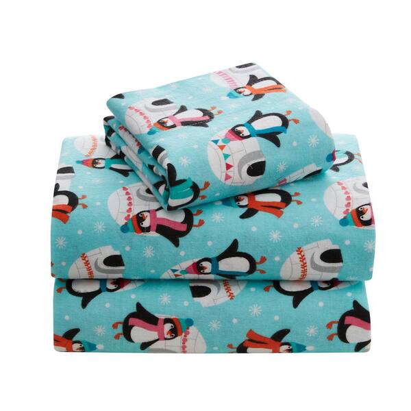 Penquin Igloos 4-Piece Blue Turkish Cotton Queen Flannel Sheet Set