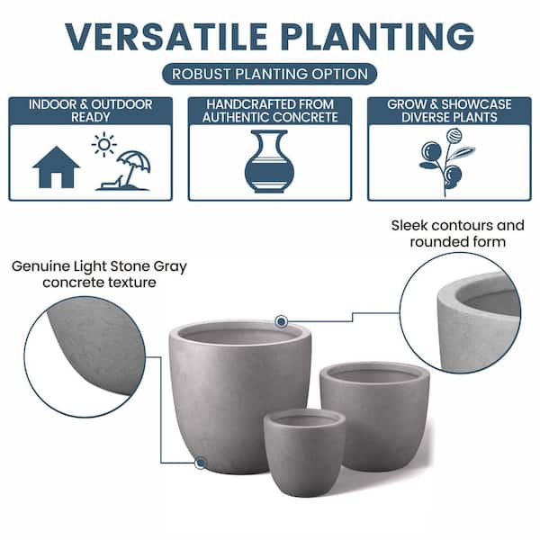 10 in. 14 in. 18 in. Light Stone Gray (Enhanced Interior) Concrete Round Planter / Pot with Drainage Holes (Set of 3)