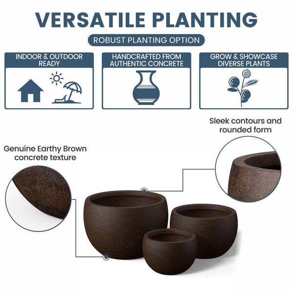 11.5 in. 15 in. 19 in. Earthy Brown (Enhanced Interior) Concrete Round Planter / Pot with Drainage Holes (Set of 3)
