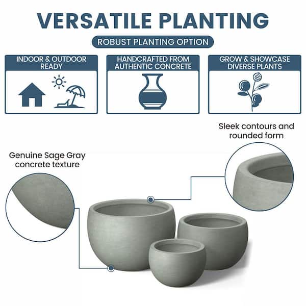 11.5 in. 15 in. 19 in. Sage Gray Concrete Round Planter / Pot with Drainage Holes (Set of 3)