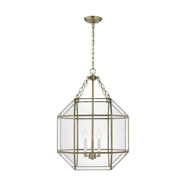 Morrison 10.5-Watt Medium 3-Light Satin Brass Shaded Pendant Light with Clear Glass Shade and LED Light Bulbs