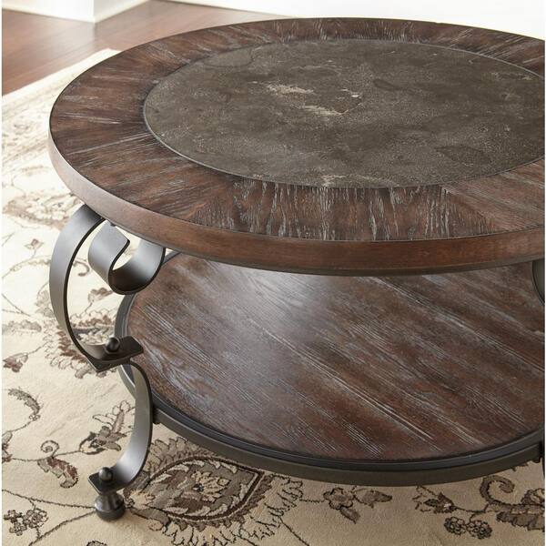 Mulberry 36 in. Dark Brown Medium Round Stone Coffee Table with Shelf