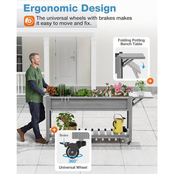 57 in. x 18 in. x 30 in. Gray HIPS Raised Garden Bed with Storage Shelf and Wheels