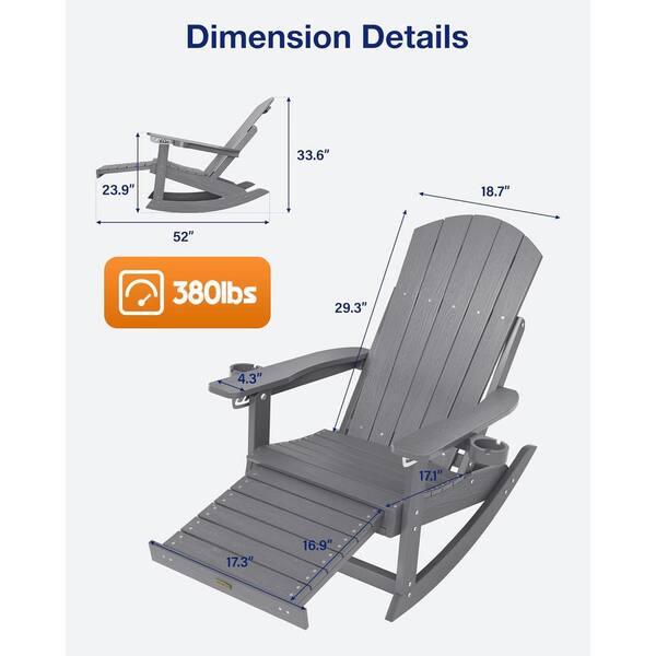 Gray Plastic Adirondack Outdoor Rocking Chair with Retractable Ottoman and Cup Holders