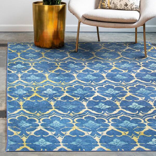 Leilani Damask Blue 5 ft. x 7 ft. Machine Washable Area Rug