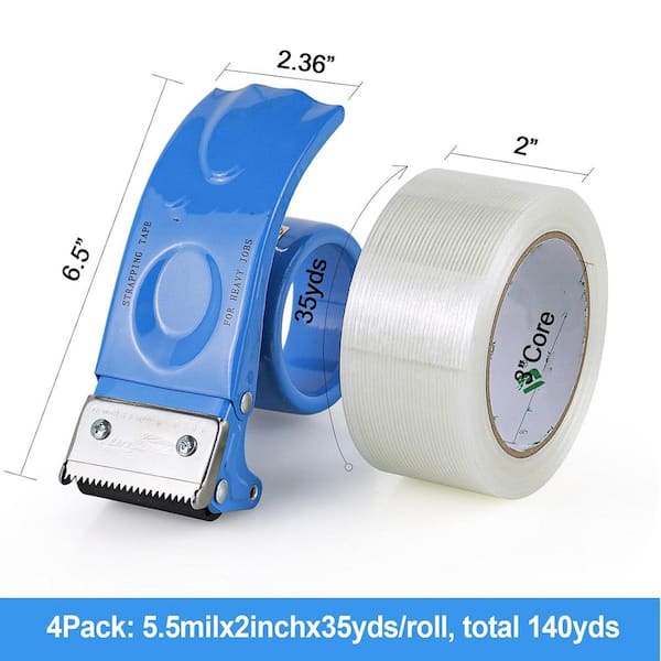 2 in. Heavy Duty Fiberglass Reinforced Packing Tape with Dispenser for Moving and Shipping 4 Rolls 140 yds. Total
